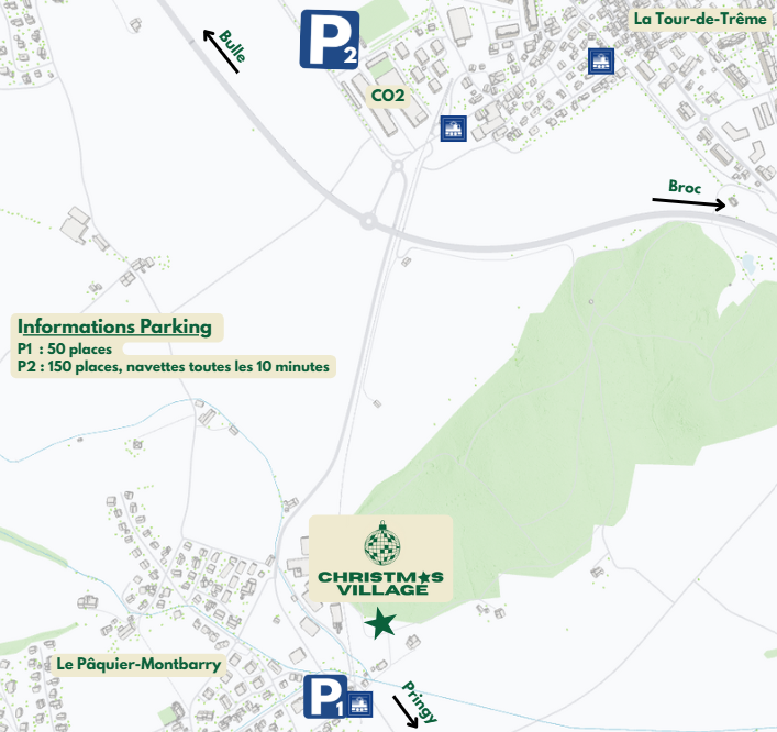 Nous avons un parking prévu pour les visiteurs à la Salle polyvalente du Pâquier, qui se situe à 2min à pied de la place de fête. Attention, les places sur ce parking sont limitées, en cas de forte affluence, notre second parking se situe à la salle CO2 de la Tour-de-Trême, qui sera desservie pas un bus navette en continue. Merci de se référer aux informations transmises par notre personnel sur place.